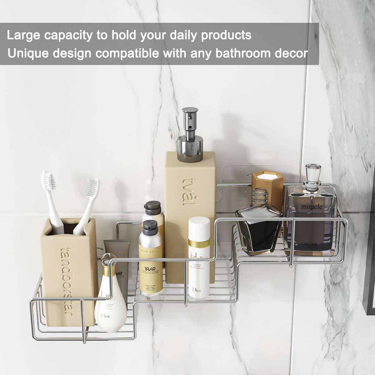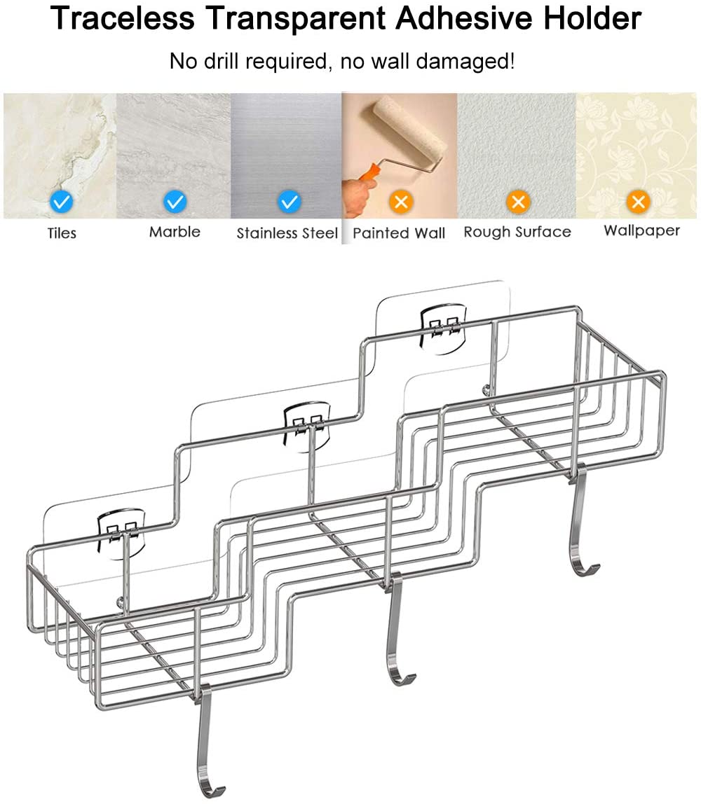 - POWERFUL ADHESIVE & DAMAGE FREE – Adhesive design. No damage to the wall and tool needed. Strong transparent adhesive ensure the bathroom shelf-stable, max hold 30 lbs in daily use after 5 year testing on smooth hard surfaces, more durable and stronger than the suction cup.