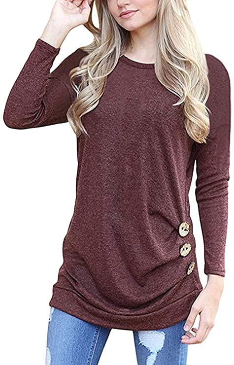 - Feature:Crewneck,Long sleeve,Button Decor design,solid tunic shirt,falling shoulder sleeve.
